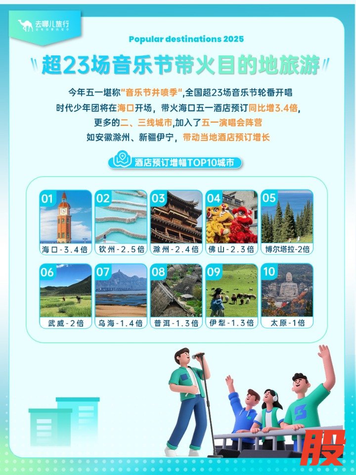 从去哪儿大数据来看,在主要旅游城市中,海口五一酒店预订量增幅最高,同比去年五一增3.4倍。与此同时,更多二、三线城市加入五一演唱会阵营,带动当地酒店预订创新高。如安徽滁州凭借葫芦果音乐节,带动当地五一酒店预订增2.4倍;新疆伊宁蜜桃音乐嘉年华联华证券,带动酒店预订同比增1.3倍。