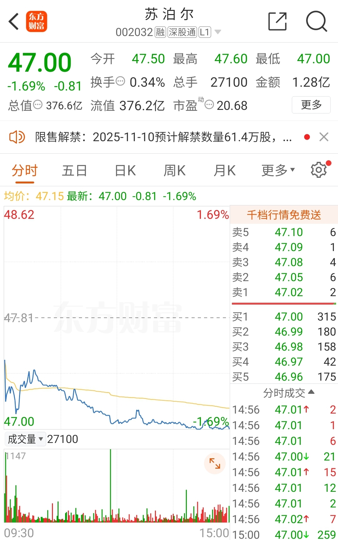 截至10月24日收盘鼎红金投,苏泊尔报47元/股,最新市值376.6亿元,今年来公司股价微跌5%,走势弱于大盘。