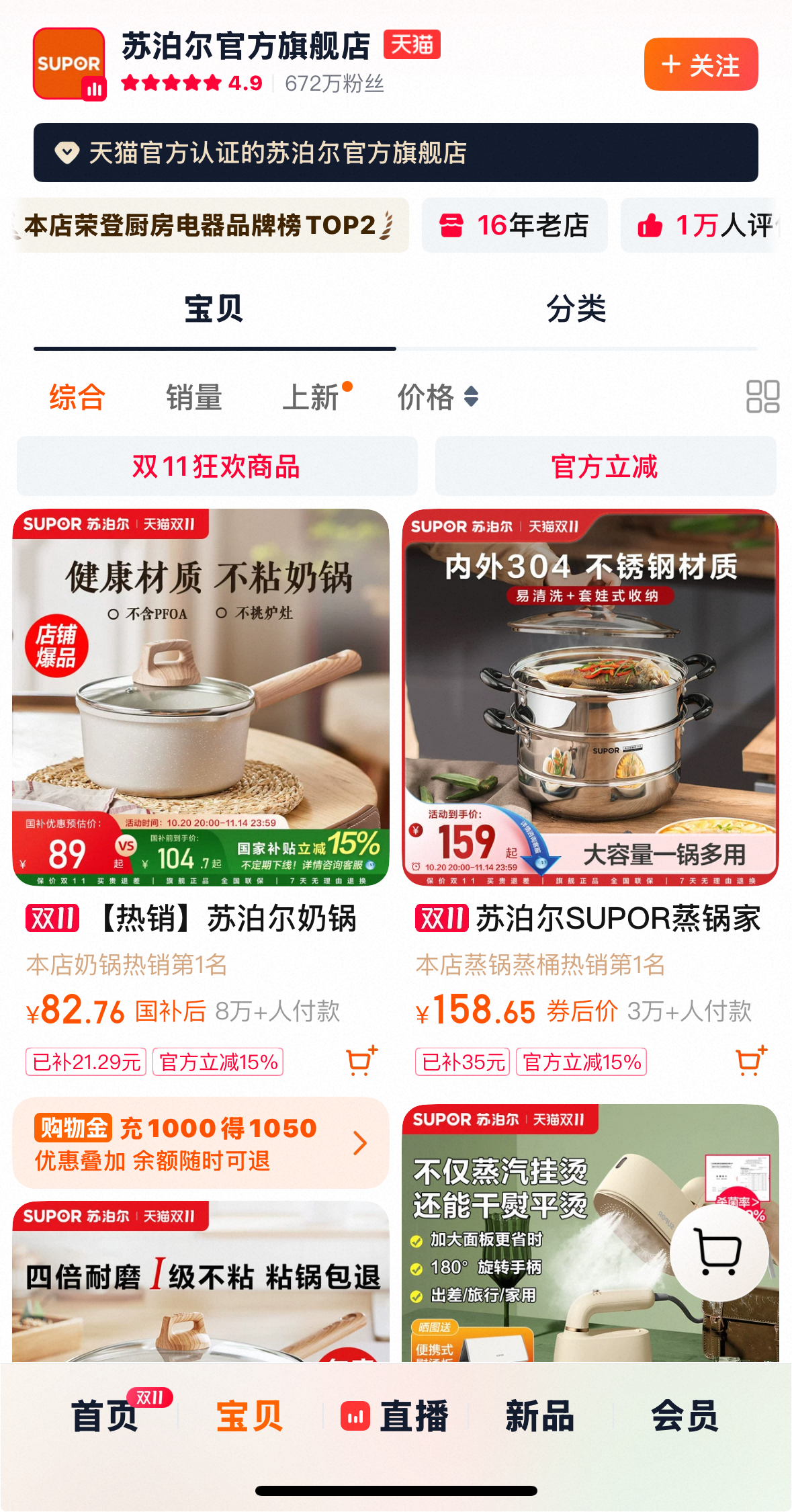 海报新闻记者了解到,今年双十一期间,苏泊尔线上多重优惠落地。抖音平台10月9日至14日开启消费券发放,用户可在清洁电器、吸烫机等直播间点击小黄车领券即享抵扣。淘宝苏泊尔官方旗舰店推出“满400减40”满减,叠加3期免息、国家补贴15%。此外,直播间还有爆款直降、秒杀单品及档位礼品,部分不粘锅三折开售并赠蒸笼等配件。