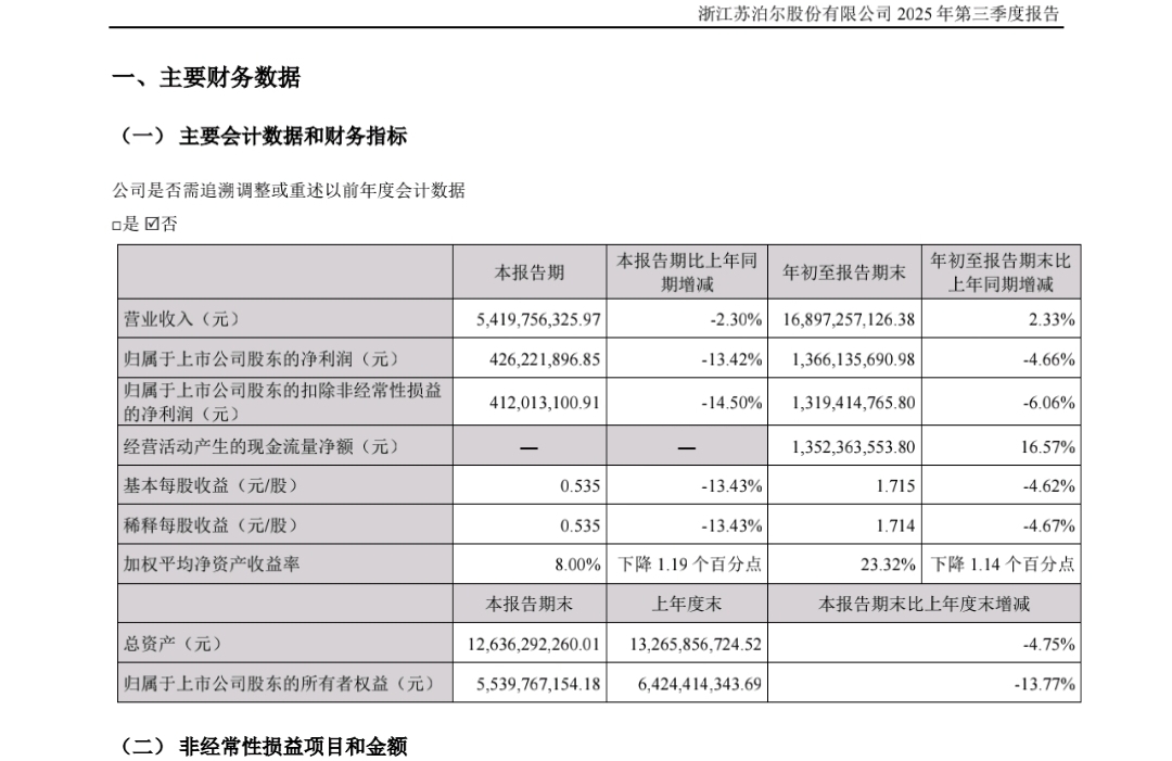 23日晚间,苏泊尔发布三季度财报,前三季度实现营业收入168.97亿元,同比增长2.33%;归母净利润13.66亿元,同比下降4.66%。其中,第三季度单季营收54.2亿元,同比下滑2.3%;净利润4.26亿元,同比下降13.4%。这一数据反映出公司在消费市场波动下的增长压力。