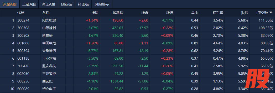 个股方面,阳光电源成交额超111亿元居首,中际旭创、新易盛、中国中免成交额靠前。